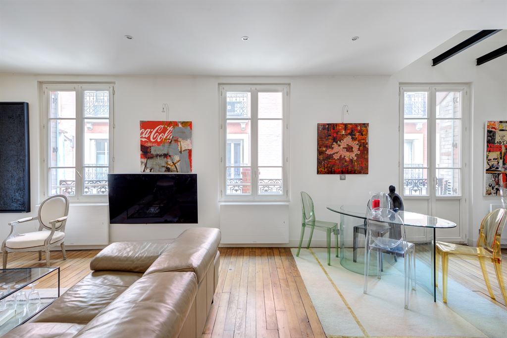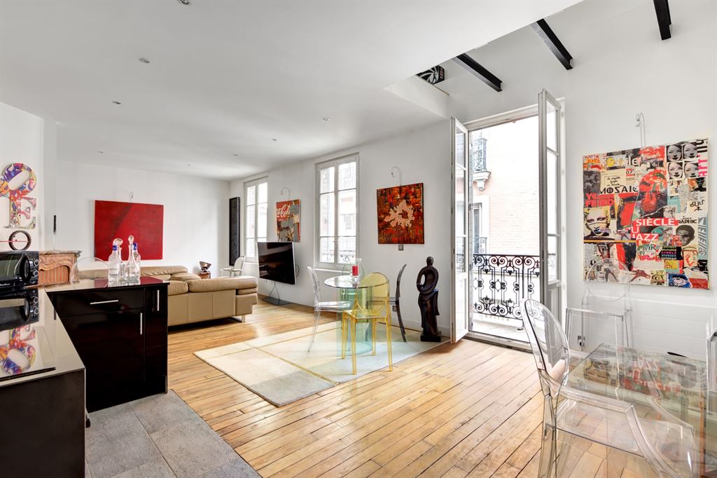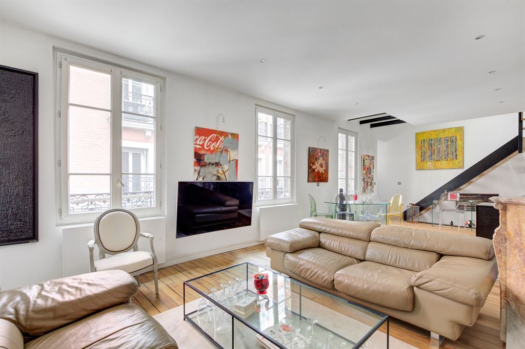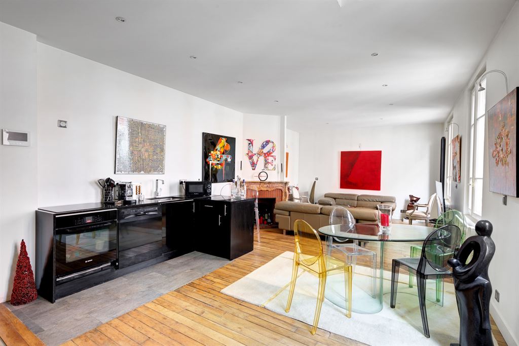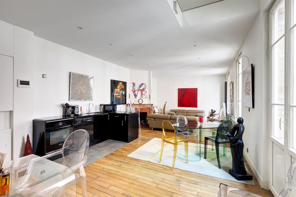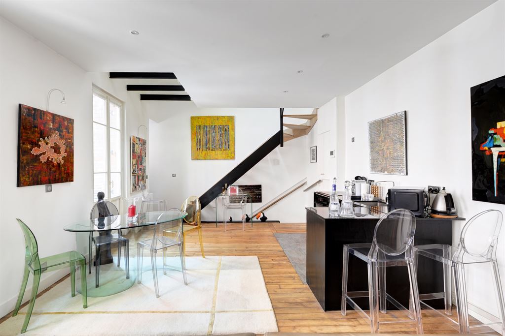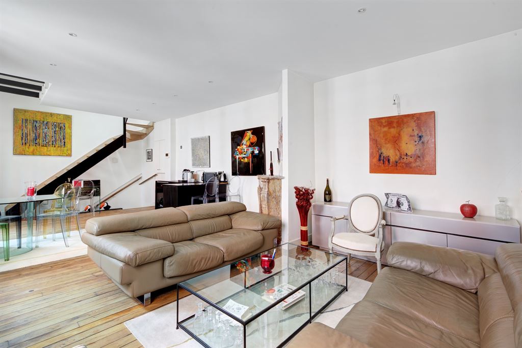 A l’étage, un grand séjour avec cuisine US ouvrant sur une terrasse de 8 m2, à l’étage supérieur une grande chambre.